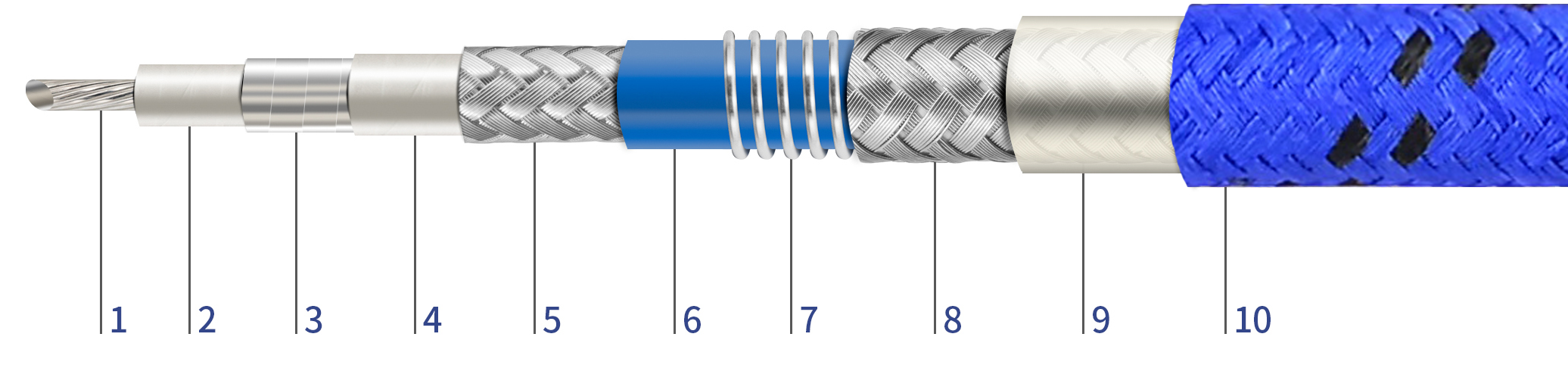1.Center Conductor/Silver Plated Copper(Solid or Stranded) 2.Dielectric/Low Density PTFE 3.Inner Shield/Silver Plated Copper Tape 4.Interlayer/PTFE, Wrapped 5.Inner Braid/Silver Plated Copper Wires 6.Inner Jacket/Blue,FEP 7.Spring Member/Stainless Steel Wire 8.Outer Braid/Silver Plated Copper Wires 9.Waterproof Layer/PI+PTFE 10.Outer Jacket/PTFE Wire, Blue |