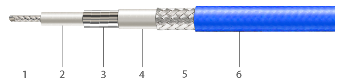 1.Center Conductor/Silver Plated Copper(Solid or Stranded) 2.Dielectric/Low Density PTFE 3.Inner Shield /Silver Plated Copper Tape 4.Interlayer/PTFE, Wrapped 5.Outer Braid/Silver Plated Copper Wires 6.Outer Jacket/Blue FEP |