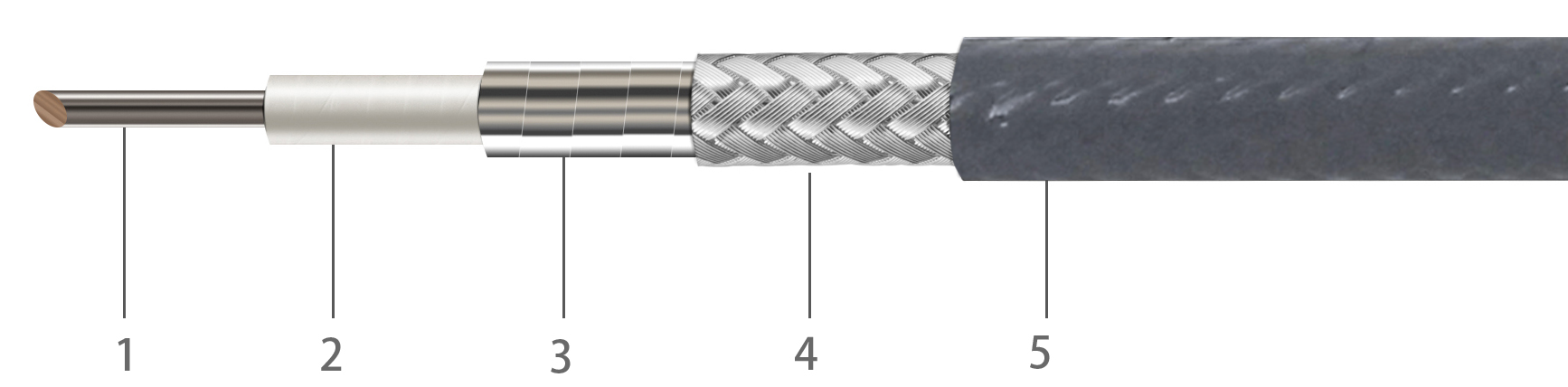 1.Center Conductor/Silver Plated Copper(Solid) 2.Dielectric/Low Density PTFE 3.Inner Shield /Silver Plated Copper Tape 4.Outer Braid/Silver Plated Copper Wires 5.Outer Jacket/Gray PFA |